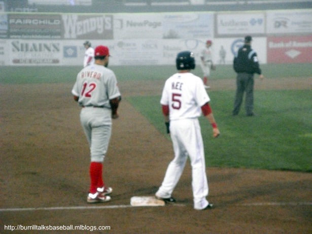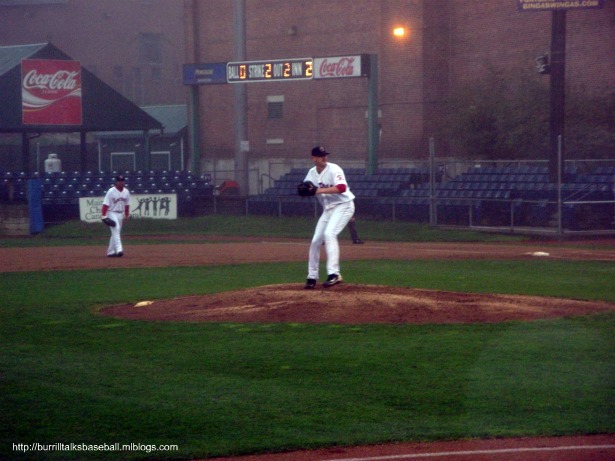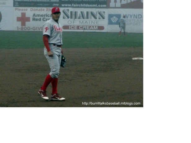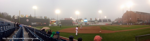 For some reason I’ve dreamed of visiting Hadlock Field in Portland for some time, and this ballpark didn’t disappoint. It’s smaller than you might think for Double A, but it’s very cozy. You kind of feel boxed in, but in a good way…sort of like leaving the rest of the world behind when your watching a ball game. One really unique aspect of Hadlock is that the home bullpen is elevated inside the right field wall. The players have to take a set of stairs to a doorway in the wall to enter the game. The Sea Dogs also have their own version of the Green Monster, er, Monsta, with the Maine Monster in left field being a Boston Red Sox affiliate and all. This was another game with low attendance due to the horrible weather, but at least they played it. The Reading Phillies were in town and we were seated right behind their dugout. I have to give a shout out to Reading first baseman Matt Rizzotti for hitting two home runs in the game and throwing me a game ball. Things didn’t go the Sea Dogs way in the game, but they had one more game in the series to get revenge. I was really looking forward to the noon game the next day. Due to the weather I didn’t get some better pics of the stadium, but will have some in the next post because the weather was better the next day. Final Score: Sea Dogs 3, Phillies 14.