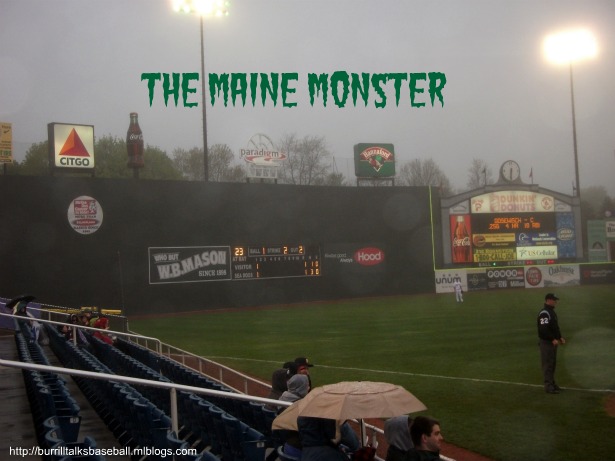 Love the Maine Monster! I think it’s neat when the affiliates show their close ties to the Major League team. It adds to the feeling of history and community. I really want to see a photo of that bullpen. I’m having a hard time picturing it in my head. I love that kind of rainy weather but not for baseball watching. Still, even with the loss it sounds like you had fun. Good luck to the Seadogs this afternoon!