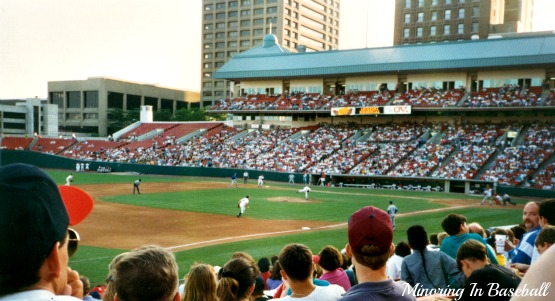 Next week I’ll be returning to the place where my Minor League pilgrimage began…Buffalo, New York. Almost 19 years ago back in 1993, I took in my first Minor League baseball game watching the Buffalo Bisons. It was during one of the best experiences of my life. I was just a student, but as part of the U.S. Customs Explorers, we were working security at the World University Games that took place in Buffalo. It was great being part of all of the events, and meeting so many people from all over the world. On our free time, we took in a couple of Bisons games, and even a few international games that were part of the WUG. With our badges, we were able to get into any of the events for free, so that gave us a chance to see quite a bit. I really liked Pilot Field (now Coca-Cola Field), and thought the site lines with the city were great. I look forward to returning and seeing all that’s changed. Luckily, I came across these pictures by mistake while in my garage last week. When moving so much, you lose track of so much stuff, and it was pure chance that I found these. Enjoy this blast back to 1993, and in the coming weeks I’ll have pics of how the ballpark looks now!