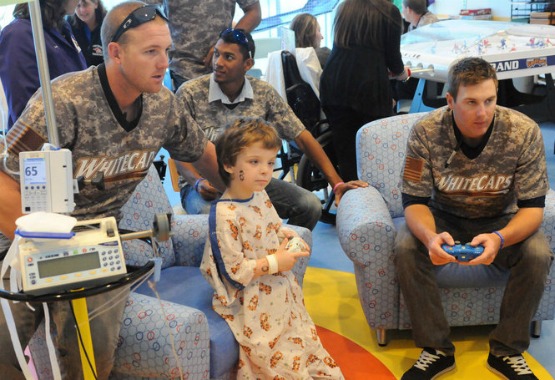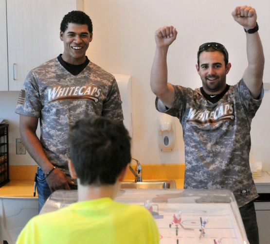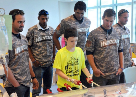 Baseball is a game for children of all ages, and on Friday the West Michigan Whitecaps took that statement to heart. Members of the team spent the day at the DeVos Children’s Hospital, putting smiles on little faces that need it the most. One of those smiles belonged to eleven year-old Colin Bradley of Grand Rapids. This young man has recently been diagnosed with Leukemia, and has a rough schedule of treatments ahead of him. He had a fun day playing stick-hockey with ‘Caps outfielder Steven Moya and relief pitcher Nick Avila, though.