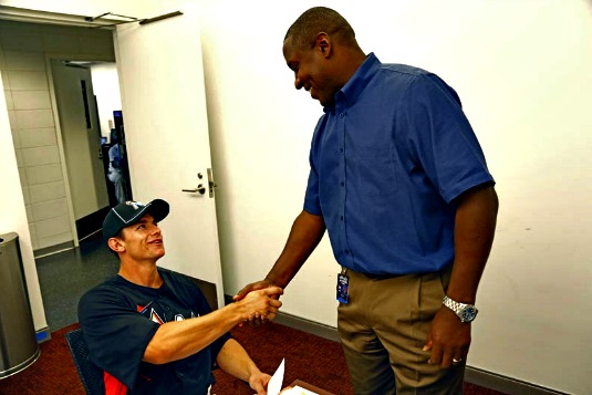 Brantly with Marlins GM Michael Hill signing his Major League contract.