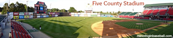 Five County Stadium–Zebulon, NC: It was a bit of a day of polar opposites, as we arrived in Zebulon to watch the MudCats. The GPS couldn’t find the stadium address, either, so getting there was a bit of a chore, but once we got our of Raleigh and headed east, it was all good. It was a Monday night, and it’s been my experience that games on this night are generally not well attended. I really didn’t expect, like, fifteen to twenty fans to be there, though. Really…I’m not exaggerating. Lucky for the MudCats, too, that I was meeting up with an old friend that I played baseball with in high school, to add to the attendance. At least it was a quiet game, so my buddy Chris and I could catch up a bit, and talk about old times. I also had a chance to explore the ballpark some and get some pictures. Five County Stadium is very unique, and I really like the way it’s set up. There are not too many rows of seats in the lower level, but mostly in the upper level. The upper level seats hang over the dugouts, and really give you a nice view of the game. As with most of the stadium in North Carolina, there was plenty of netting, too, to protect the fans. A little too much for my tastes, but I was able to move around it to get some more pictures. Despite the low attendance, the on field DJ still had some fun with the fans who were there, and the mascot Muddy the MudCat (a giant catfish) wandered the concourse, as did a gorilla chasing a giant banana. See how fun the minors are? I’m sure the atmosphere is better when the stands start filling up this summer, and I did very much enjoy my first Carolina League game in Zebulon. At least I was able to catch a foul ball, but waited until there was two outs in the ninth inning to do it!