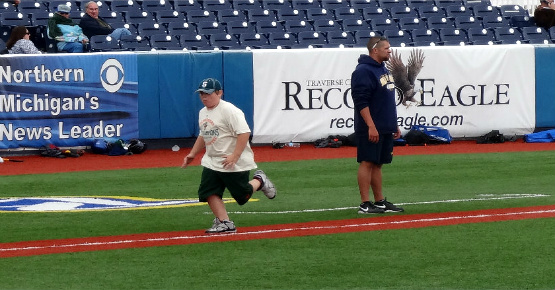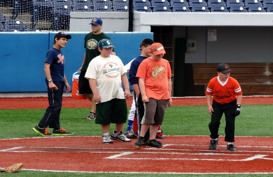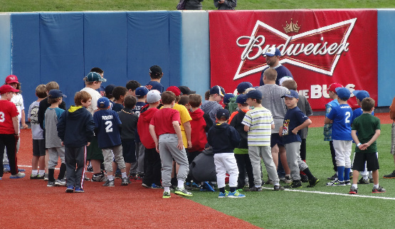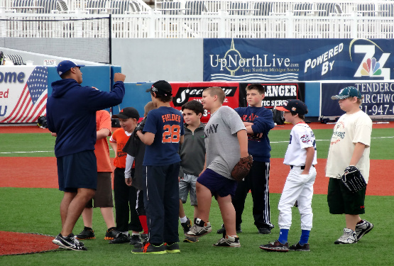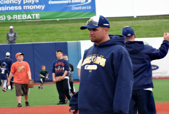 Wuerfel Park–Traverse City, MI: As Trevor’s Little League season came to an early end this summer due to shoulder problems, we weren’t sure if he was going to participate in this baseball academy hosted by the Traverse City Beach Bums. As his x-rays were examined, he was cleared to play, but we also found out that he wasn’t dealing with a sprained shoulder, but a broken clavicle. The bad news is that even though it’s looked to have healed, it also still causes him extreme pain. Trevor is a trooper, though, and gave the camp a go. The gates opened early, and the players came and got the kids promptly at ten a.m. After some stretching and warming up, the kids were separated into five stations. Trevor’s first station was hitting. They did soft-toss with tennis balls in the outfield. He never got under one to get it over the fence, but had a few nice line-drives. His next station was in the outfield, working on pop-ups and fly balls. The Beach Bums really had some fun and unique drills to help the kids adjust to catching a ball on the fly. This is one of the biggest weaknesses of kids this age, so I’m glad they taught them some of these manuevers. The kids’ next stop was the bullpen, for some pitching drills. By this point, Trevor’s shoulder was causing some major discomfort, so he sat this one out. I don’t think he feels like he’s pitching material anyway, as he prefers to be behind the plate. After the pitching portion of the academy was complete, his group headed in for some base-running. They did some good drills that taught them how to run through the bag at first, and round it if the ball got through the infield. The kids really liked sliding on the artificial turf, too. He ended his day doing some infield drills. The Beach Bums did a great job of encouraging the kids, even when they made an error. They reminded them that the pros make mistakes, too, and not to get discouraged.