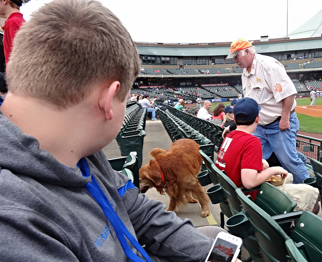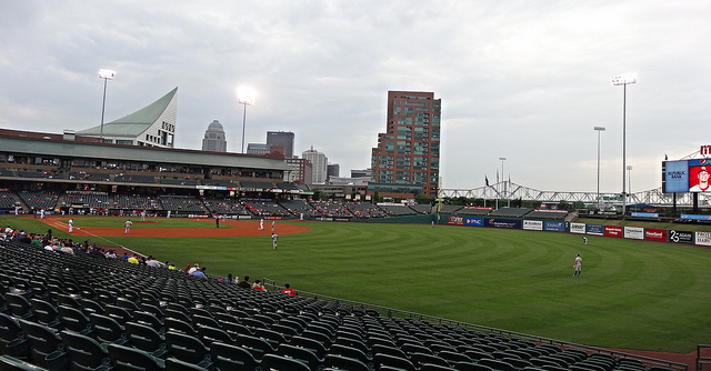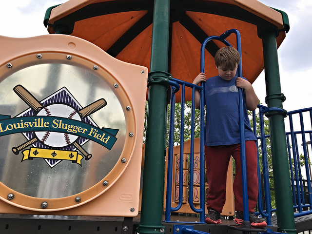 Louisville Slugger Field-Louisville, KY: Well, it only took us a few days in town to hit our first Bats game. Trevor has been here before, back in 2009, but this was Brian’s first experience here. Due to the weather, though, the pre-game kids clinic was postponed, so I’ll have to wait until June to see Brian take the field here. He had fun playing on the playground, however, and the caro carous caris merry-go-round. Trevor and I took a selfie with the MiLB app, and reminisced about our game here seven years ago.