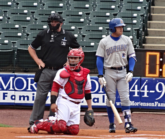 We sat over by the Durham Bulls bullpen, or Bull-pen, and had a great view of the game. Brian was hoping to meet mascot Buddy Bat, but he was busy on field pretty much the whole game, and never made it into the crowd. One of the ballpark staff members mentioned that he’s more active in the crowd during weekday games.