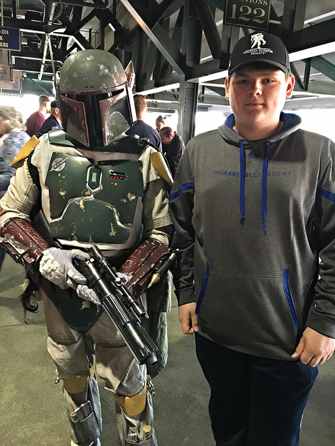 When the Star Wars characters started making their way to the concourse, the boys and I decided to join them. First of all, Brian was really happy just to finally meet the Bat’s mascot, Buddy Bat!