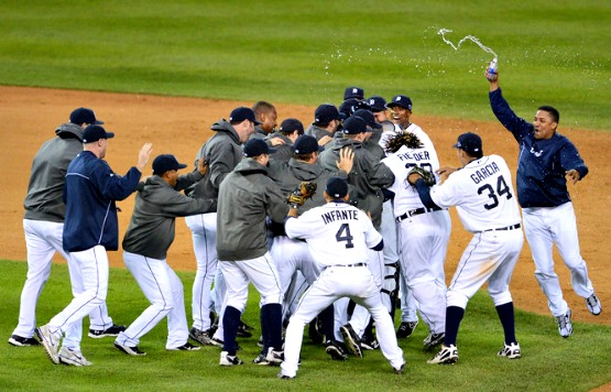 West Michigan Whitecaps alumni Omar Infante celebrates with his Tiger teammates after clinching the Central Division Title