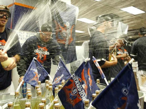 Former West Michigan Whitecaps Brennan Boesch and Ramon Santiago celebrate the Tigers winning the American League Pennant!!!