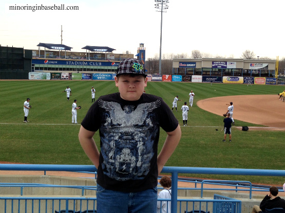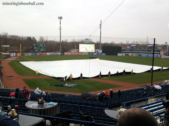 Fifth Third Ballpark-Comstock Park, MI: Well, this was our first ballgame of the season, and the Michigan weather treated us about as well as can be expected. I want to make a statement, too, that I loathe the Weather Channel. They are complete liars, and I will never trust them again. Never. Despite what mother nature through at us, though, we had a fun time together at the Whitecaps game, and I still was happy just to be watching live baseball. The kids had a fun time, and the game was part of their Papa’s birthday present. I was still impressed at how good Fifth Third Ballpark looked after the fire in January, too. They did a good job of rebuilding it and getting it ready for the season. We settled in and grabbed some hot dogs and pop for the kids, and a beer for my dad and I. The boys and I went down to the field level to watch pitching coach Mike Henneman work with some of the staff, and see some of the warm-ups. The game was off to a good pace with lots of action early on. I really like how Andrew Graham is working this team; lots of movement on the base paths, bunting, and smart baseball. Lily took Brian to the park for a short time, and he was able to meet the new mascot, Roxy, a female River Rascal. The rain hit us about the third inning, but we toughed it out until the tarp came out after the top of the fifth.