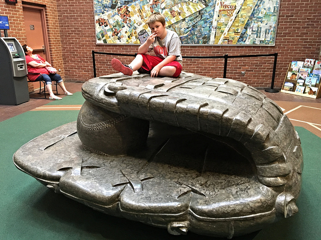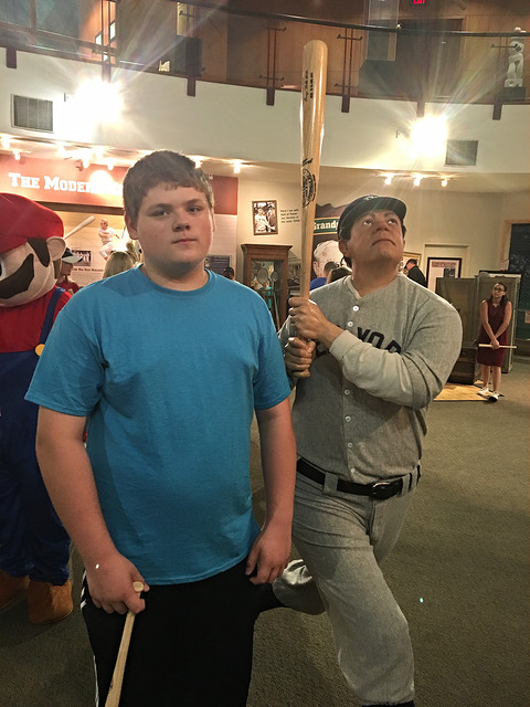 After the tour, we checked out the permanent exhibits at the museum. There are many relics and bats from the all-time greats of this sport! Below, Brian looks good with Hank Aaron’s bat, and he’s grown up with stories of ‘Shoeless’ Joe Jackson, so he was a little in ‘awe’ of ‘Black Betsy’.