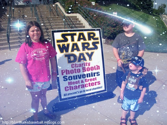After we mingled with members of the Galactic Empire and Rebellion, we were able to take a stroll around the warning track of Fifth Third Ballpark. Personally, I never turn down an opportunity to walk around on a professional baseball field. Jedi Franky welcomed us onto the field, and was able to get a few good pics of the boys.
