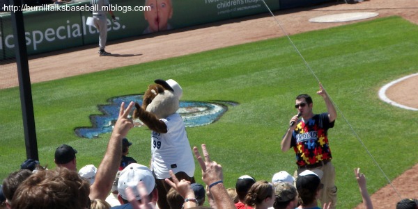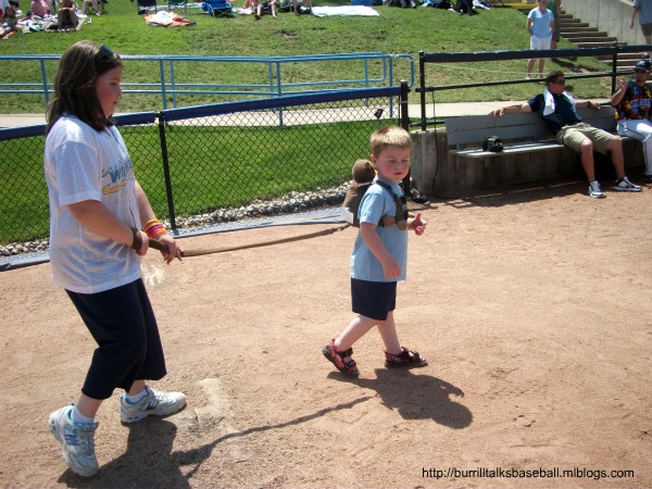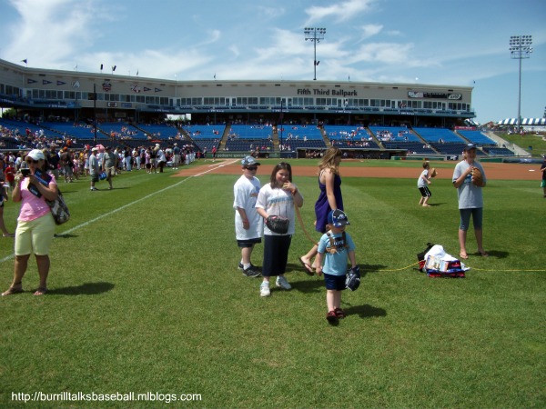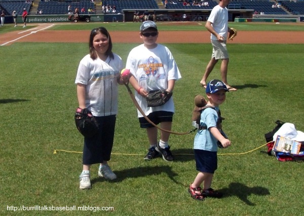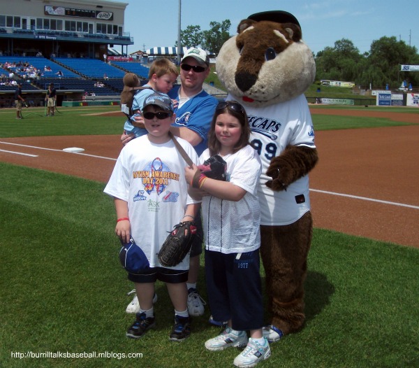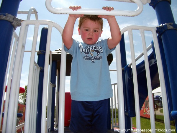 It was a beautiful day for baseball, so I packed the kids up and took the long trip back down to Grand Rapids to give Brian his first taste of Whitecaps baseball. This was a little new to him, with a bigger crowd, so I decided to get a harness so the little guy couldn’t just run off on us. He did pretty well, but wasn’t real happy that he couldn’t run free when he wanted to. A couple of the pics will show him pouting a bit, but he has happy to watch baseball, as were Lily and Trevor. I was Sunday, so we were able to get onto the field, but opted to play catch rather than stand in line for autographs. The kids liked playing catch with me and their Papa (three kids at a ballgame is tough, so I’m glad my dad was there to help out, too). It was fun to be on the field, but they wanted to play on the playground there, too, until the game started. It was pretty hot by our standards, so we ended up pouring cold water on each other and the kids had some ice cream to cool them off, too. We got seats at the very top row on the isle because I knew we’d be getting up and around a lot with the little guy. I hate it when people are constantly getting up and interrupting the game, so I wanted to show some courtesy. Even though we were higher up, there’s no bad seat in the house, and kept us out of the sun under the over hang. It was Autism Awareness day also, so the ‘Caps wore special jerseys that were auctioned off after the game. The Whitecaps’ bats were as hot as the weather, as they pounded out sixteen hits in the game. The kids were a little too tired to run the bases after the game, but we had a great time and look forward to more game together. Next month is Star Wars night, so that should give us a memorable night. Final score: Whitecaps 10, Kernels 3.