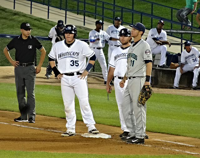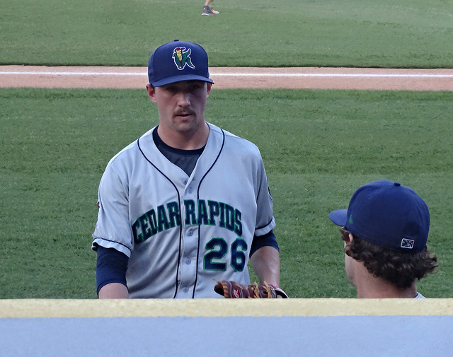 The game was going pretty quick, as both the Kernels Sam Gibbons and the ‘Caps A.J. Ladwig were locked in a pitchers duel. Gibbons kept West Michigan off of the board until the seventh inning. Down 1-0, left fielder Christin Stewart smacked a double that put runners at second and third, with no outs, to really get things going. Designated-hitter Joey Pankake then singled to score two runs and the Whitecaps had a 2-1 lead. Stewart was awarded the run, as the Kernels’ catcher was blocking the plate without the ball. Cedar Rapids manager Jake Mauer was tossed by the home plate ump for arguing the call. Not well-played, Mauer. Things fell apart a bit for the Kernels, as they made two errors and hit a batter, as the ‘Caps chased Gibbons and took a 4-1 lead.