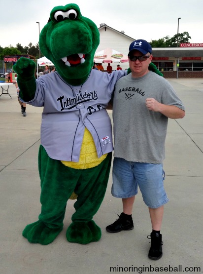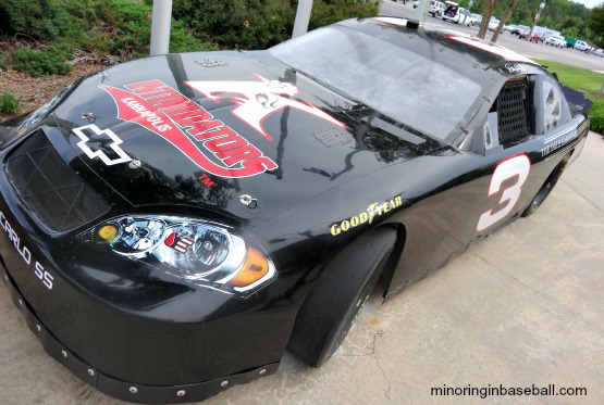CMC-Northeast Stadium-Kannapolis, NC: Wow…what to do on a day when we only have one game scheduled to attend? Well, if you’re into the nascar thing, then you would have enjoyed our experiences. Our first stop was in Concord, NC, home of the Charlotte Motor Speedway. Despite the advertising of daily tours around the track, we found they were cancelled because some trucks were practicing all weekend. Great luck, so we poked around a bit and headed out. Just down the street there was a nice little car museum, so we decided to check that out. The highlight for me was seeing a couple of cars used in the movie Talladega Nights: The Ballad of Ricky Bobby (if you’re not first, you’re last…). We still had plenty of time before our game in Kannapolis, so, sticking with the nascar theme, we decided to head back into downtown Charlotte to the nascar Hall of Fame. Our experience there was ok, but decided just to head back north to Kannapolis. We arrived a little early, but noticed that the gates were open. The ballpark wasn’t really open to the public then, but I started chatting with head of ticket sales, and he was nice enough to open the gift shop for me so we could get our souvenirs and put them back in the car before the game. The whole Intimidators staff was very friendly, and treated us well. We actually had time to take and little snooze in the car before the gates officially opened. Before heading inside, though, I took a few pics of the race car parked in front of the stadium…sticking with the nascar theme, of course. Kannapolis is the birthplace of deceased nascar driver Dale Earnhardt, and the Intimidators are named after him. Inside, we had plenty of time to explore the small ballpark before the game began. This included hanging out with mascot Tim E. Gator. The concourse was nice, and wide open. There were some good eats, too, but we just stuck with beer and hot dogs. I bought seats in the V.I.P. section, right next to the Intimidators dugout. On a two dimensional seating chart, the seats looked great, but in reality, I had a huge pole directly in front of me, and couldn’t see anything. With a small crowd, we quickly found new seats. CMC-Northeast Stadium is a nice, unique, ballpark, and was a good low-key end to our adventures in North Carolina, as I really love the South Atlantic League.