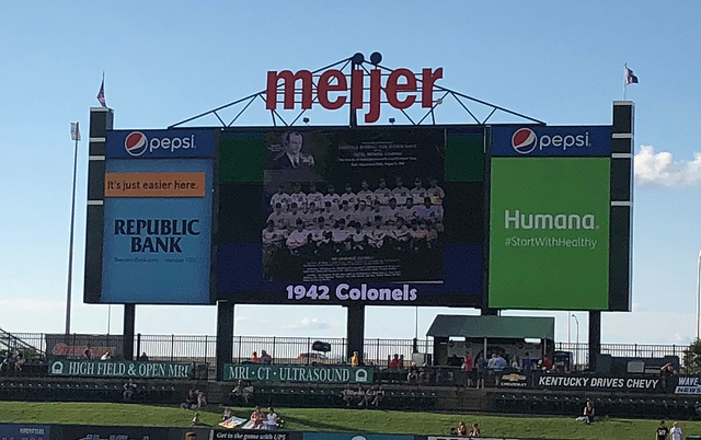 Louisville Slugger Field-Louisville, KY: What to do when your kids are up in Michigan visiting their mom? Call your best friend down from Ohio to catch a ballgame, that’s what! The Bats, celebrating a throwback weekend, were playing as the Louisville Colonels (who were a founding member of the National League). They also held a ceremony before the game to retire the numbers of Louisville’s own Pee Wee Reese (1) and his Brooklyn teammate, the great Jackie Robinson (42).