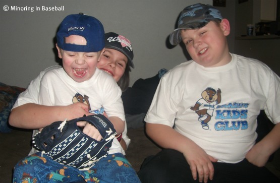 This season I thought I’d set the kids up with a little treat, and enter them in Crash’s Kids Club. Crash, the mascot for the West Michigan Whitecaps, is always very popular at the ballpark. Brian, especially, really gets a thrill out of a simple ‘high-five’ from the gigantic river rascal. The kids club isn’t a bad deal, though, even for a family who makes only a handful of game during the season. For only $25 per kid, they get a t-shirt, a Kids Club certificate, express lane to run the bases at every Sunday game, and free tickets to every Sunday game. They also have a chance to be randomly selected to do things like throw out the first pitch or watch an inning from the dugout. The younger ones will also have a chance to hang out this the PBS kids characters before some of the games (like Clifford and Curious George…two of Brian’s favorites!). It almost pays for itself, though, if we make it to even a couple of Sunday games and with the t-shirts. Of course the kids had to try them on after the packages came in the mail yesterday. But…does it look like ANY of them could act normal for a photo? Of course not, just as goofy as they can be. Oh, well, that’s the way kids are supposed to act, isn’t it? Other than Lily and Trevor giggling like Beavis and Butthead at the name of the sporting goods store….