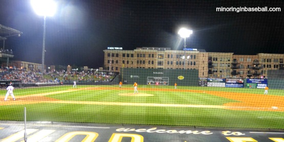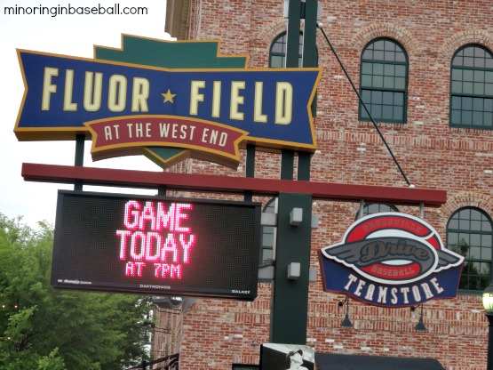 Flour Field-Greenville, SC: After flying into Charlotte, we headed south for the first game of our trip. We were about five miles from the Greenville exit, though, when traffic came to a stop. Complete stop. It took us about forty minutes to go that five miles, but we finally made it to Flour Field downtown well before game time. As with most downtown stadiums parking is scarce, so if you visit here be sure to leave yourself some time. The gift shop is outside the stadium, so it’s was easy to get our shopping done and leave it in the car. The Greenville Drive is affiliated with the Red Sox, and they really embrace the Nation. The outfield at Flour Field is replicated after Fenway Park, they have their own ‘green monster’, and they even sing ‘Sweet Caroline‘ in the eighth inning. It was a good crowd with a fine baseball atmosphere, also. Lots of kids and families watching the game which is good to see. My only complaint about the stadium is that the netting extends beyond the dugouts, so it was difficult to see the game at times.
