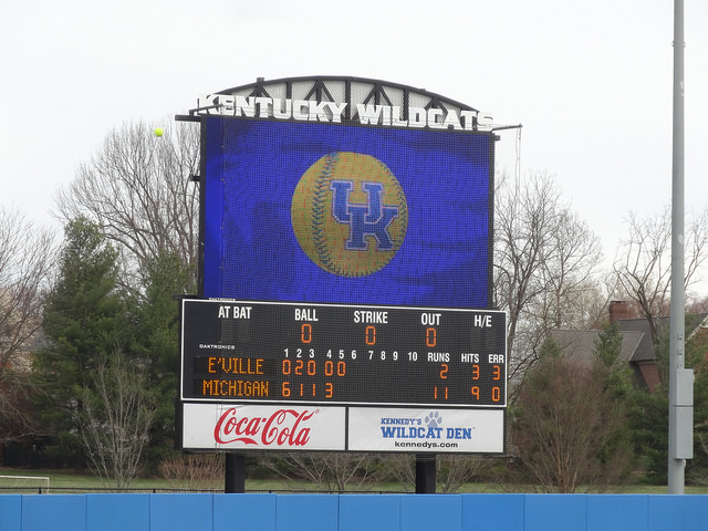 John Cropp Stadium-Lexington, KY: Our original plan for after our adventure at the Stache-A-Palooza, was to check out some Kentucky Wildcat baseball. The team was scheduled to play Miami (Ohio) at 1:00 at Cliff Hagan Stadium. Uh, however, when we arrived at the Cliff, we found it empty, with no baseball teams in sight. Apparently, the game had been rescheduled, but we never saw any notification of this. Still not sure WHY the game was changed, the weather wasn’t as bad as the day before, but maybe because the UK basketball team was playing at the same time? Personally, I think it’s stupid to re-arrange baseball for stupid basketball, but again, that’s just me. Not letting this ruin our day, though, we drove over to the UK softball venue, John Cropp Stadium, to find the ladies hosting a tournament there, aptly named the John Cropp Classic. The Michigan Wolverines were playing the Evansville Aces when we arrived, and it was cool to see a somewhat (old) home team on the field. We enjoyed the game, as the Wolverines made short work of the Aces. Final: Michigan 11, Evansville 2.