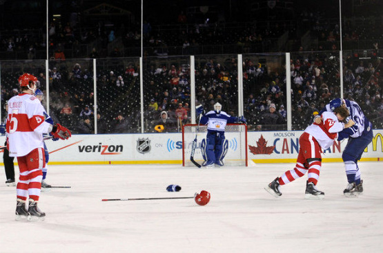 Baseball and hockey, the two sports loves of my life, going together like chocolate and peanut butter. And with this outdoor hockey thing really catching on, more teams and leagues are taking part in this type of event every year. So whoever decided to build a hockey rink in the middle of a frozen baseball park, is simply brilliant. Although this is not a new concept, this past weekend was the first outdoor game for our own Grand Rapids Griffins. The Griffins took on the Toronto Marlies at Comerica Park, home of the Detroit Tigers, in American Hockey League action. The game was part of Detroit’s Winter Festival, which featured in-state high school, NCAA, Ontario Hockey League, and the Griffs AHL game. The Comerica Park venue also hosted two alumni games from the Detroit Red Wings and Toronto Maple Leafs. The Griffins, the defending Calder Cup Champions, and off to the best start in franchise history, found themselves tied at three all after regulation and overtime against the Marlies, however. It looked like a great experience for all involved, and will hopefully lead to more events like this in the future. I would really like the Griffins to stay close to home, though, and maybe one day play at an outdoor game at Fifth Third Ballpark, home to the West Michigan Whitecaps. This would be another great venue for hockey, with many successful high school, college, and professional teams in the area. You can even look at what the Rochester Red Wings did with their Frozen Frontier this season, as a model of success. From what I’ve read, Frontier Field did a phenomenal job of hosting hockey of all levels last month, and the same could be done at other minor league stadiums in the north. Although a Frozen Fifth Third may be a pipe dream, I guess I’ll have to wait until April to see some action there. Until then, we plan on hitting a Griffins game very soon.