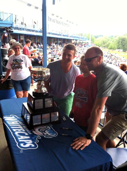 This is just a quick post, as we’re getting ready to head south to the Grand Rapids area for Star Wars Night at the Whitecaps game tomorrow night. The fans in West Michigan have been pretty busy, as the ‘Caps have had plenty of promotions on the current home stand. On Wednesday, the 1998 Midwest Championship team was honored and the ‘Caps wore throwback jerseys of the ’90’s. Last night was special, not only because it was ’70’s night, but of the visitors to Fifth Third Ballpark. First, Benjamin Hill of MiLB.com was on hand doing his baseball thing. He gets involved in all aspects of the team, including the concessions, promotions, and between inning games. Ben is simply my hero, and you can check out all of his hi-jinks at Ben’s Biz Blog. Also attending last night game, were member of the AHL Champion Grand Rapids Griffins and the Calder Cup trophy. Area fans had the opportunity to get photos with coach Jeff Blashill, players, and the Cup. I really would’ve loved to have been at last night game to meet Ben and the Griffins. Tonight is also a special night, as Detroit Tiger legend Lou Whitaker will be there to sign autographs for fans. Being a second baseman, I idolized ‘Sweet’ Lou growing up here in Michigan. My Little League obligations have kept me in town, though, but we’ll be at Star Wars night tomorrow!