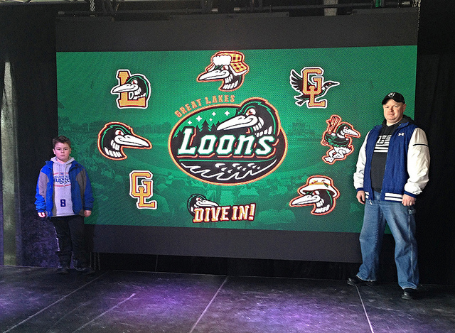 Dow Diamond-Midland, MI: On Saturday the Great Lakes Loons kicked off their 10th season with an event to unveil their new logo and uniforms. The concourse at Dow Diamond was able to be enclosed, and we were able to enjoy the presentation, along with all of the other activities, in relative comfort. The presentation started with a video that showed some of the highlights of the first nine seasons of Loons baseball. Then the new logos were revealed, all together, and then they went over each one. My favorite is probably the Loon with the fishing hat. In won’t show each one individually, but you can see them all between the top and lower photo of Brian and I.