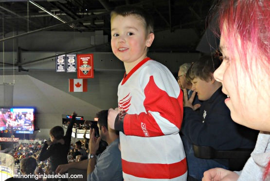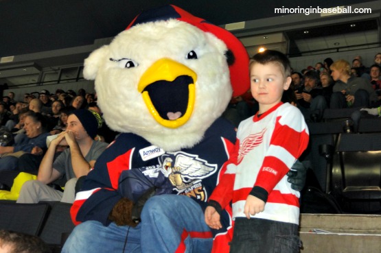 Van Andel Arena-Grand Rapids, MI: After a fun afternoon at the West Michigan Whitecaps’ Open House, and a great meal at Enza’s Pizza, we made out way to the Van Andel Arena for an evening of AHL hockey featuring the home town Griffins taking on San Antonio. The Griffins won the Calder Cup last season, and were out to their best start ever in 2013, but injuries to parent club the Detroit Red Wings have depleted the roster here in GR. The Griffins still have a lot of fight in them, though, and it was fun to finally make it down to a game this season. The kids really like Van Andel Arena, also, as it’s the biggest one they’ve had a chance to visit so far. They also had a free hockey figure promotion, and we all know how much kids love getting free stuff. Brian finally got to meet one of the Griffins’ mascots, so he was all his glory at that point.
