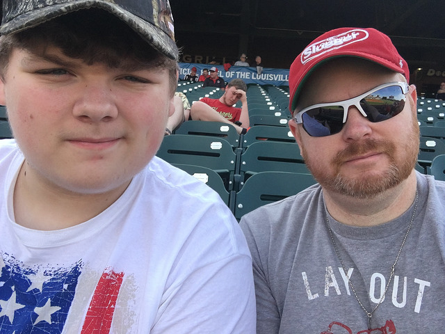 Also, as the game was a day before Memorial Day, this was a good time to thank and pray for all those who made the ultimate sacrifice for this great country, so my son and I can enjoy a ballgame together. At Louisville Slugger Field, there is a seat in the outfield reserved just for them. Trevor put his American flag in the cup holder of the seat, and when we came back around, there were many more there!