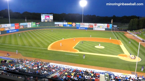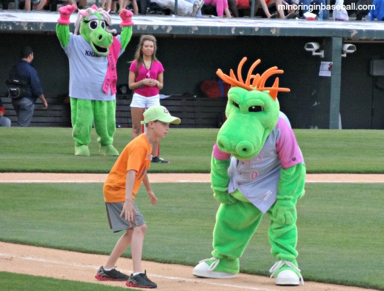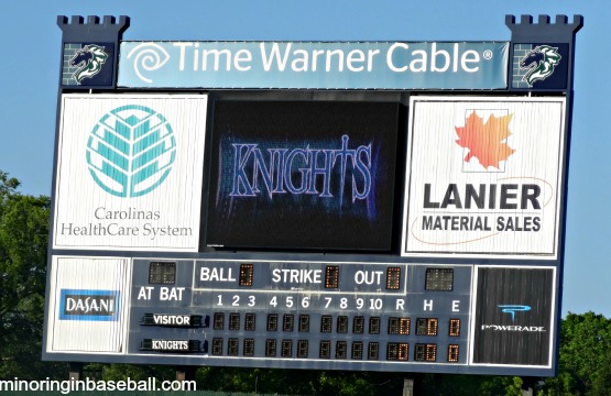 Knights Stadium-Fort Mill, SC: Well, it was a beautiful night in Fort Mill, anyway. The stadium is located just south of Charlotte. It was a Saturday game, so there was a really good crowd, and again it was good to see so many kids and families. It was also breast cancer awareness night, so the Knights were wearing their pink jerseys that were auctioned off after the game. The Knights had two mascots on hand, with Homer being the boy dragon, but I didn’t catch the name of the female one. The Charlotte Knights cheerleaders/dance team was also on hand, the lovely KnightinGals. Knights Stadium is nothing spectacular, but is good size for Triple-A. It’s a good walk up the stairs from the front row to the concourse. Some fans are excited by the new stadium being built downtown, but most feel it will bring higher prices for tickets and concessions. The current stadium isn’t that far from Charlotte, and has plenty of parking, so I think an upgrade would be better than a new one. We ended up moving from the front row to the upper deck to get a better view of the action, too. There’s not a bad seat in the house, but we love the upper deck. We met some great baseball fans in Charlotte, and it was a great night for baseball.