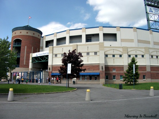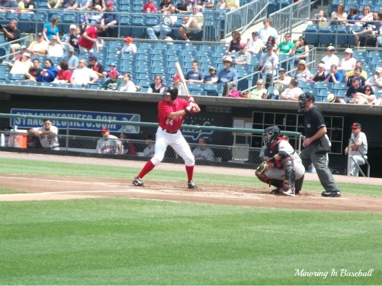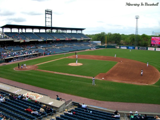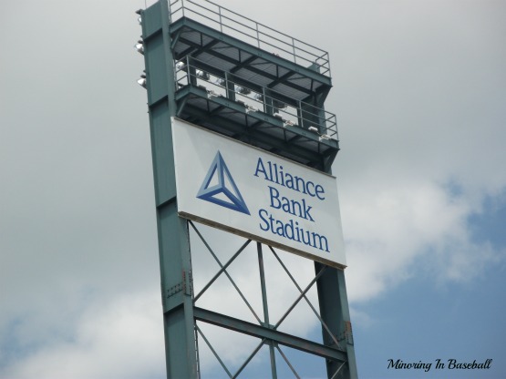 Alliance Bank Stadium-Syracuse, NY: I know I’ve mentioned this before, but I love being at the ballpark early in the day. The grass still smells so fresh, and it just seems like the day was made for baseball, and nothing else. We were also blessed with another beautiful spring day to make us even more comfortable. Because of the noon start, eating lunch at the ballpark was essential. If you like hamburgers, this is the ballpark for you, as they have many different varieties, though they are pricey at $8 a piece. They offered good hot dogs, also, and a cold beer helped kick the day off. Since we sat in the front row for yesterday’s game, we decided to gain a little altitude and get a different perspective. One thing that I like about Bank Alliance Stadium, is that is does have a second deck to it, which is rare, even for Triple-A stadiums. The view of the game was fantastic, and in all honesty, if I had season tickets here, this is where they would be. I do like seeing at least a couple of games in the same ballpark, and getting a different feel for the crowds and seats. Syracuse cruised to another win, too. Final: Chiefs 6, Red Wings 4.